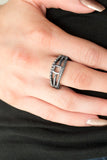 Serrated and studded gunmetal bands flank a glistening band featuring an airy square centerpiece for a casual look. Features a dainty stretchy band for a flexible fit. Sold as one individual ring.