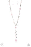An array of translucent pink crystal-like beads and shiny silver accents trickles along a lengthened silver chain. A matching pink crystal teardrop swings from the bottom of a matching silver chain that has been attached to the refined design, creating a timeless extended pendant. Features an adjustable clasp closure. Sold as one individual necklace. Includes one pair of matching earrings.