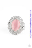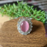 Encrusted in dainty white rhinestones, a frilly silver frame spins around a glowing pink moonstone center for a regal look. Features a stretchy band for a flexible fit. Sold as one individual ring.