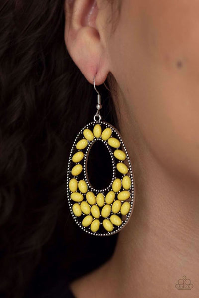 A collection of oval Illuminating beads collect inside a studded silver oval frame, creating a bright pop of color. Earring attaches to a standard fishhook fitting. Sold as one pair of earrings.