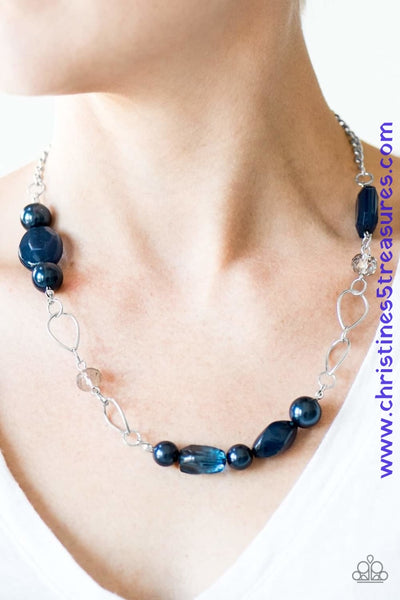 Featuring pearly, polished, and glassy finishes, refreshing blue beads trickle below the collar in a refined fashion. Faceted crystal-like beads and teardrop shaped frames are sprinkled between the colorful accents for a beaming finish. Features an adjustable clasp closure. Sold as one individual necklace. Includes one pair of matching earrings.
