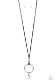 Infused with a pair of classic silver beads and a white rhinestone encrusted accent, lengthened black leather cording knots around a bold silver hoop for a knockout look. A lobster clasp hangs from the bottom of the design to allow a name badge or other item to be attached. Features an adjustable clasp closure. Sold as one individual lanyard. Includes one pair of matching earrings.