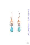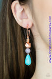 A charismatic collection of glassy, amethyst, and turquoise stone beads, accented with a shiny copper faceted square bead, are threaded onto a pin which dangles from a dainty shiny copper hoop. Earring attaches to a standard post fitting. Hoop measures approximately 3/4" in diameter. Sold as one pair of hoop earrings.