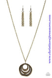 Hammered in an array of mismatched textures, 3 asymmetrical hoops join into an abstract pendant at the bottom of a lengthened brass chain for a handcrafted look. Features an adjustable clasp closure. Sold as one individual necklace. Includes one pair of matching earrings.