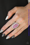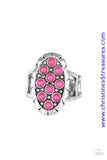 Dainty pink stones are sprinkled across the front of a studded silver frame, creating a vivacious centerpiece atop the finger. Features a stretchy band for a flexible fit. Sold as one individual ring.