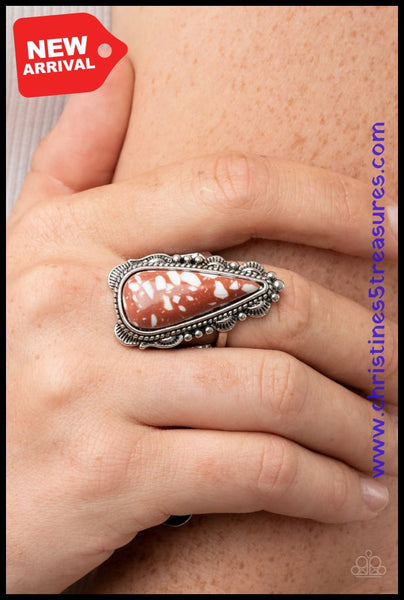 An oversized and speckled brown teardrop stone is nestled inside a silver frame studded and embellished in antiqued silver details for an authentic finish. Features a stretchy band for a flexible fit. Sold as one individual ring.