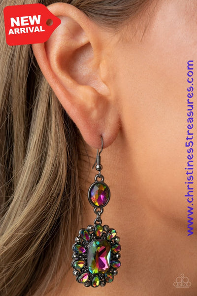 Dainty hematite rhinestones and teardrop oil spill gems fan out from an oversized oil spill emerald cut gem at the bottom of a solitaire oval oil spill gem, resulting in a glamorously glitzy lure. Earring attaches to a standard fishhook fitting. Sold as one pair of earrings.
