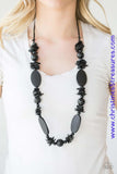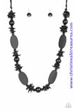 Shell-like, round, and flat wooden beads are threaded along shiny black cording, creating a summery palette. Features an adjustable sliding knot closure. Sold as one individual necklace. Includes one pair of matching earrings.