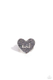 Brushed in a glittery iridescent finish, a black heart frame rests atop airy silver bands for a retro glamorous look. The word "kind" is centered atop the heart frame for an optimistic finish. Features a stretchy band for a flexible fit. Sold as one individual ring.