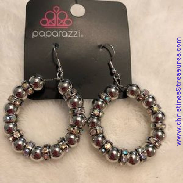 Glistening silver beads and iridescent rhinestone encrusted silver rings alternate along a dainty wire hoop, creating a glamorous display. Earring attaches to a standard fishhook fitting. Sold as one pair of earrings.