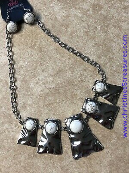 Rippling with hammered details, flared silver frames join below the collar, creating a fierce fringe. Refreshing white stones are pressed into the tops of the frames for a colorful finish. Features an adjustable clasp closure. Sold as one individual necklace. Includes one pair of matching earrings.
