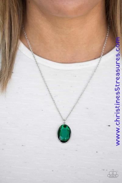 Pressed into a sleek silver frame, a faceted green gem swings below the collar for a glamorous look. Features an adjustable clasp closure. Sold as one individual necklace. Includes one pair of matching earrings.