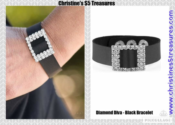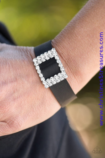 Encrusted in glassy white rhinestones, a dazzling frame slides along a strip of black leather, creating a blinding centerpiece atop the wrist. Features an adjustable snap closure. Sold as one individual bracelet.