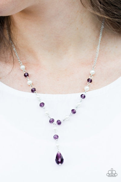 Dainty white pearls alternate with purple crystal-like beading along a silver chain. An extension of pearls and crystal beading cascades from the chain, giving way to a dramatic teardrop pendant for a vintage inspired look. Features an adjustable clasp closure. Sold as one individual necklace. Includes one pair of matching earrings.