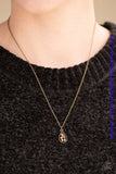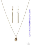 Glittery topaz rhinestones and a brown moonstone are pressed into the center of a studded brass teardrop, creating a dainty pendant below the collar. Features an adjustable clasp closure. Sold as one individual necklace. Includes one pair of matching earrings.