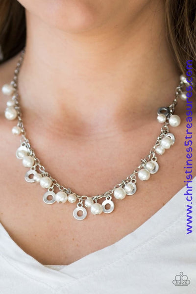 Varying in size, pearly white beads trickle from the bottom of a shimmery silver chain. Airy silver discs trickle between the pearl accents, creating a refined fringe below the collar. Features an adjustable clasp closure. Sold as one individual necklace. Includes one pair of matching earrings.