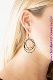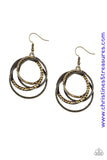 Encrusted in sections of aurum rhinestones, mismatched brass hoops layer into an elegantly entangled lure. Earring attaches to a standard fishhook fitting. Sold as one pair of earrings. 102918