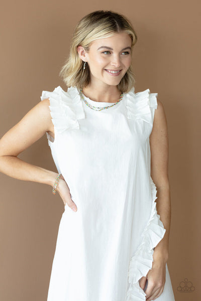 A dainty collection of faceted silver beads, multi-colored seed beads, and silver cubes are threaded along multiple strands of silver wire below the collar, creating clustered layers. Features an adjustable clasp closure. Featured inside The Preview at GLOW! Sold as one individual necklace. Includes one pair of matching earrings.