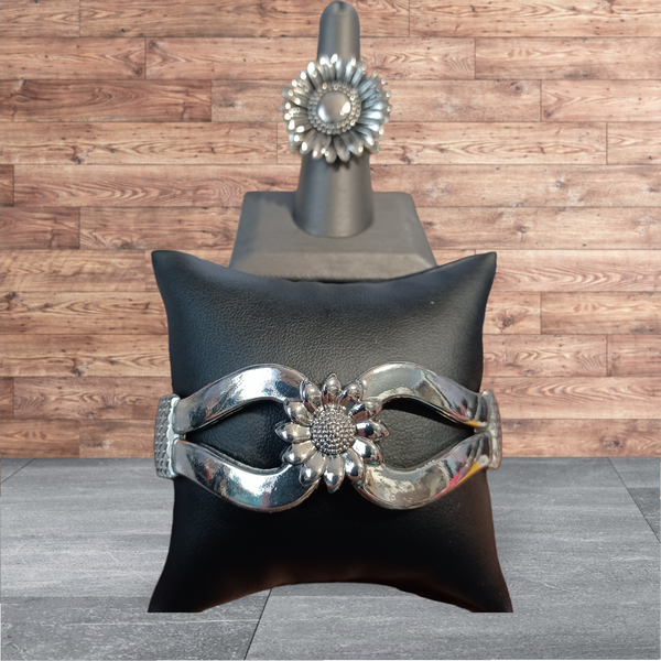 Brushed in an antiqued finish, a rustic silver daisy blooms atop a decorative studded and embossed silver band for a simply seasonal look. Features a stretchy band for a flexible fit. Sold as one individual ring.