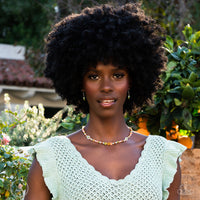 Multicolored seed beads and silver accents are threaded along a wire, falling along the collar in a capricious pattern. Creating additional charm to the design, white, olive, light green, light pink, coral, and brown seed bead flowers in varying sizes blooms amongst the bright pops of color. Features an adjustable clasp closure. Sold as one individual choker necklace. Includes one pair of matching earrings.