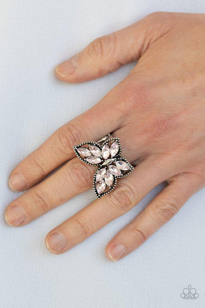 The wings of a studded silver butterfly have been adorned in glittery pink marquise rhinestones, creating a glamorous centerpiece atop the finger. Features a stretchy band for a flexible fit. Sold as one individual ring.