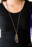 Featuring studded and antiqued textures, a dramatic copper feather pendant swings from the bottom of an elongated copper chain for a free-spirited fashion. Features an adjustable clasp closure. Sold as one individual necklace. Includes one pair of matching earrings.