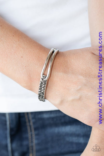 An airy silver fitting links with a silver band encrusted in two rows of glittery hematite rhinestones across the wrist, creating an edgy bangle-like cuff. Features a hinged closure. Sold as one individual bracelet.