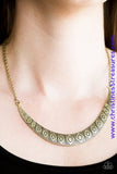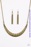 Stamped in tribal inspired patterns, a brass crescent-shaped plate swings from the bottom of a shimmery brass chain, creating a bold pendant below the collar. Features an adjustable clasp closure. Sold as one individual necklace. Includes one pair of matching earrings.