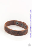 Stamped in a leafy pattern, a skinny distressed leather band wraps around the wrist for a seasonal look. Features an adjustable snap closure. Sold as one individual bracelet.