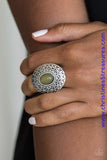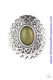 A glowing green stone is pressed in the center of a dramatic silver frame radiating with shimmery sunburst details for a seasonal look. Features a stretchy band for a flexible fit. Sold as one individual ring.
