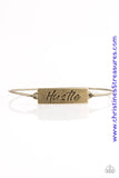 Engraved with the inspiring word "Hustle", a shimmery brass plate attaches to a skinny brass bar, creating a dainty bangle. Sold as one individual bracelet.