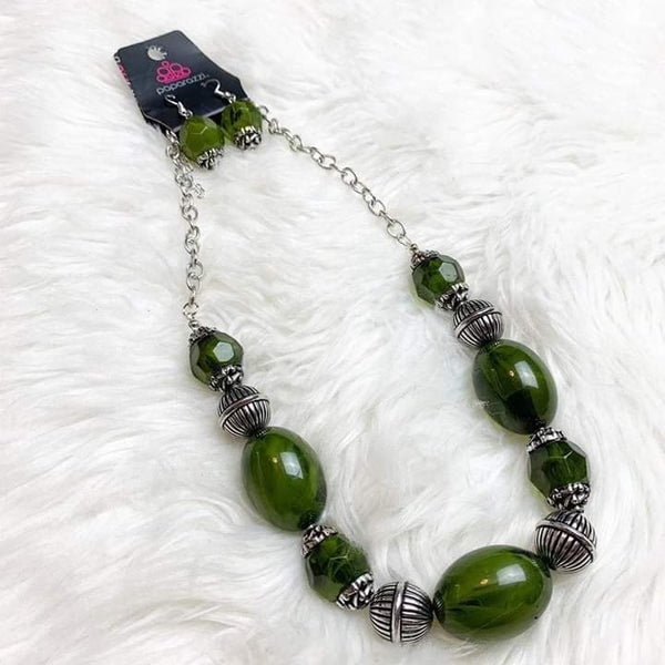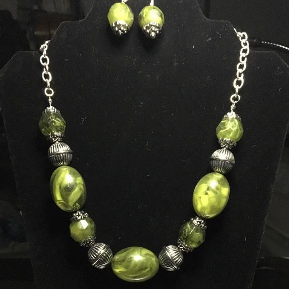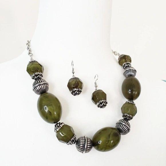 Featuring an array of antiqued silver beads, an icy collection of oversized glassy green beads are threaded along an invisible wire below the collar for a colorful, statement-making look. Features an adjustable clasp closure. Sold as one individual necklace. Includes one pair of matching earrings.