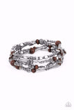 Infused with hints of brown wooden beaded accents, a mismatched collection of silver beads and textured silver accents are threaded along elastic stretchy bands around the wrist for a jungle-inspired, whimsically layered stack. Sold as one individual bracelet.