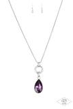 Encrusted in glittery white rhinestones, a shimmery silver ring gives way to a dramatic purple gem teardrop. The impressive pendant slides along a shimmery silver popcorn chain for a refined look. Features an adjustable clasp closure. Sold as one individual necklace. Includes one pair of matching earrings.