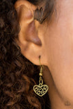 Heart-shaped filigree dances along the centers of shimmery brass heart frames. The airy frames delicately connect below the collar for a chic finish. Features an adjustable clasp closure. Sold as one individual necklace. Includes one pair of matching earrings.