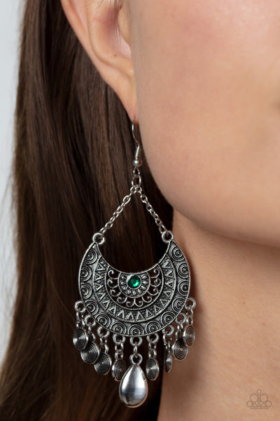 Dotted with a solitaire green rhinestone, row after row of tribal inspired patterns stack into a decorative silver crescent. Embossed with spiraling textures, dainty silver discs and a single silver teardrop frame swings from the bottom of the ornate frame for a noise-making finish. Earring attaches to a standard fishhook fitting. Sold as one pair of earrings.