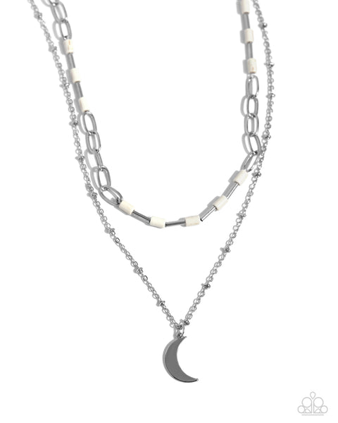 Infused along a silver paperclip strand, white and silver cylindrical beads haphazardly gleam along the neckline. A dainty silver chain with a silver crescent moon charm layers below the beaded strand for an all-natural finish. Features an adjustable clasp closure. As the stone elements in this piece are natural, some color variation is normal. Sold as one individual necklace. Includes one pair of matching earrings.
