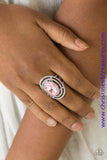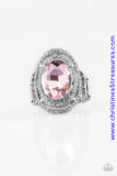 A glittery pink gem sits atop stacked silver frames radiating with glassy white rhinestones for a timeless look. Features a stretchy band for a flexible fit. Sold as one individual ring.