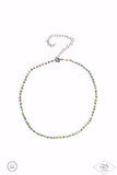 A dainty row of faceted oil spill crystal-like beads delicately links around the neck, resulting in a radiant glimmer. Features an adjustable clasp closure. Sold as one individual choker necklace. Includes one pair of matching earrings.