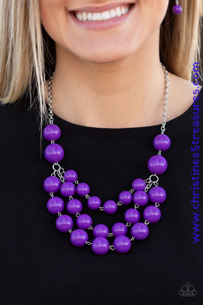 Three strands of bubbly purple beads cascade below the collar, creating colorful layers. Features an adjustable clasp closure. Sold as one individual necklace. Includes one pair of matching earrings.