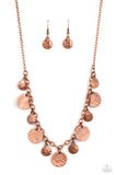 Copper discs in a variety of sizes dance along a copper chain in a charming display. The discs are hammered in texture, adding rustic, handcrafted detail to the design. Features an adjustable clasp closure. Sold as one individual necklace. Includes one pair of matching earrings.