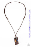 A piece of brown leather, dainty black, brown, and blue stone pendants are knotted at the bottom of a shiny brown cord for an urban look. Features an adjustable sliding knot closure. Sold as one individual necklace.