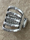 Stamped in the inspirational words "love", "hero", "mother", "trust", and "teach", five silver bands layered down the finger for a whimsical look. Features a stretchy band for a flexible fit. Sold as one individual ring.