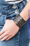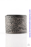 Stamped in a leafy floral pattern, a thick leather band wraps around the wrist for a bold seasonal look. Features an adjustable snap closure. Sold as one individual bracelet.