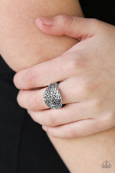 Life like leaves in a silver finish are etched with intricate detail as they connect to form a dramatic statement piece. Features an adjustable clasp closure.