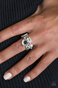 An oversized smoky gem sits asymmetrically atop stacked silver bars, creating a dramatic centerpiece. Dazzling white rhinestones are haphazardly sprinkled along the glistening layers, creating subtle sparkling accents. Features a stretchy band for a flexible fit. Sold as one individual ring.