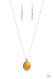 Swinging from the bottom of a lengthened silver satellite chain, an earthy yellow stone is pressed into the center of a sleek silver frame for a tranquil look. Features an adjustable clasp closure. Sold as one individual necklace. Includes one pair of matching earrings.