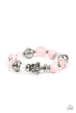 An enchanting assortment of silver floral beads and studded silver rings join an opaque, glassy, and iridescent assortment of pink and white beads along a stretchy band around the wrist for a whimsical pop of color. Sold as one individual bracelet.