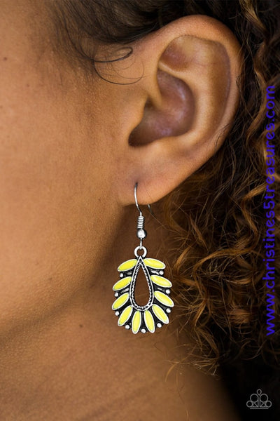 Painted in a vivacious yellow hue, colorful petals flare out from an airy teardrop center, creating a summery lure. Earring attaches to a standard fishhook fitting. Sold as one pair of earrings.