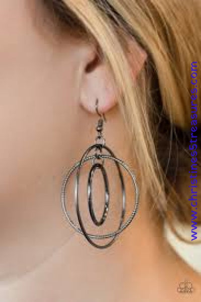 Smooth and serrated gunmetal hoops trickle from the ear, linking into a dizzying lure. Earring attaches to a standard fishhook fitting. Sold as one pair of earrings.